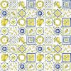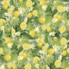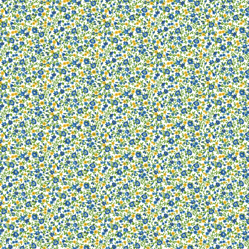 Diseño floral de pequeño tamaño con abundantes flores azules y detalles en amarillo, acompañadas de hojas verdes, repartidas de forma uniforme sobre fondo blanco. El conjunto crea una composición delicada y armónica, con un aire fresco y luminoso que recuerda a los estampados florales clásicos, aportando naturalidad y un estilo alegre y atemporal.