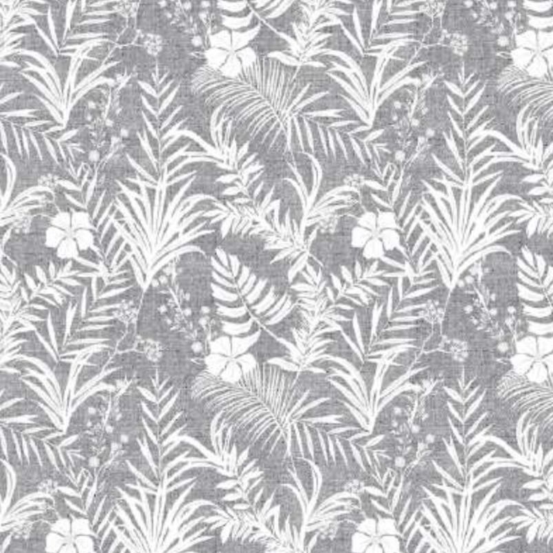 Sobre un fondo texturizado que emula la riqueza del lino en un calmado tono gris, se despliega un denso y armonioso follaje. Siluetas de hojas de palmera, helechos y delicadas flores tropicales se perfilan en un blanco crudo. Este contraste no solo aporta luz, sino que crea una sensación de profundidad y un patrón visualmente impactante pero fácil de combinar.