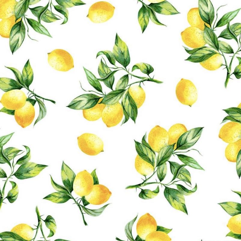 Este estampado captura la esencia de los limones recién cosechados. Racimos jugosos y limones sueltos se esparcen con gracia sobre un fondo blanco, creando un contraste luminoso y lleno de vida. Los tonos amarillos vibrantes y los verdes frescos de las hojas aportan una sensación de alegría, energía y naturalidad a cualquier creación. Es un diseño atemporal que evoca días soleados, brisas cálidas y la belleza simple de la naturaleza.