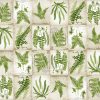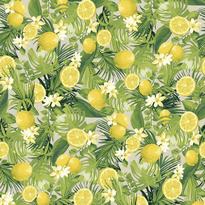 Sobre un elegante fondo texturizado de aspecto lino en tono natural, se despliega un exuberante jardín tropical. Jugosos limones amarillos, enteros y en rodajas, se mezclan con las delicadas flores blancas del azahar. Un denso y rico follaje de hojas de palmera y monstera en distintas tonalidades de verde crea una increíble sensación de profundidad y frondosidad. El resultado es un estampado dinámico, luminoso y absolutamente irresistible.