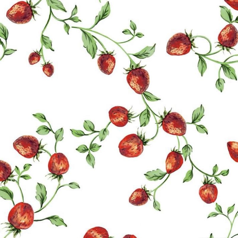 Estampado con un delicado y dulce diseño de fresas, perfecto para evocar la primavera y el verano. Sobre un fondo blanco, las ilustraciones de fresas y sus tallos enredados aportan un aire romántico y campestre. Este estampado es ideal para crear ambientes luminosos y frescos en la cocina, el comedor o el jardín.