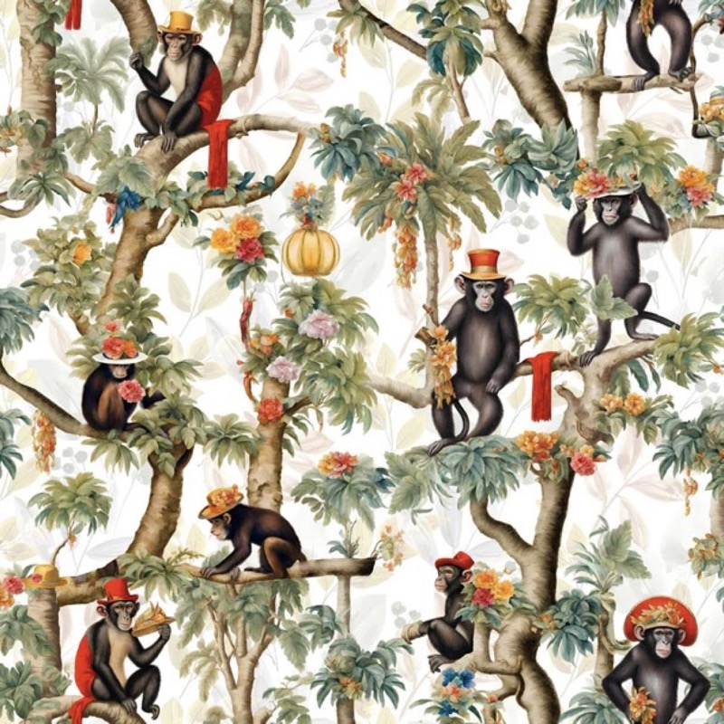 Este patrón captura la esencia de una jungla de fantasía, con un estampado de monos vestidos con sombreros de copa que se posan entre ramas y flores exóticas. Es la opción perfecta para quienes desean infundir energía y vitalidad en sus espacios con un toque de excentricidad.