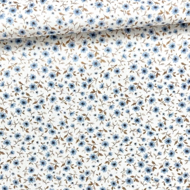 Este tejido presenta un patrón de pequeñas flores azules y hojas beige que se distribuyen de forma armoniosa sobre un fondo blanco. Es ideal para proyectos que busquen un estilo romántico y natural.