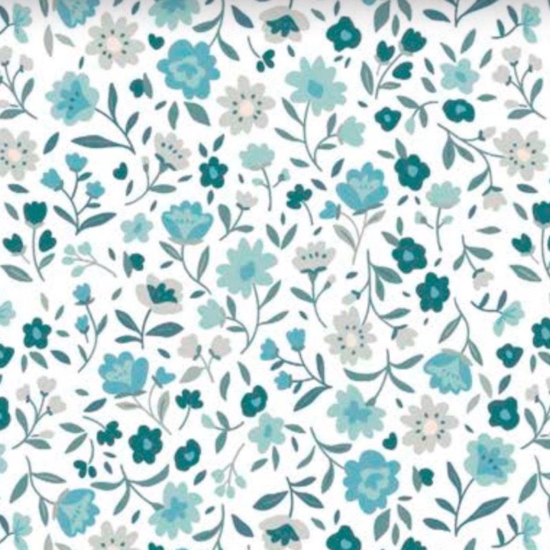 Este diseño evoca la belleza de la primavera con un encantador estampado de flores y hojas en tonos de azul y azul claro que se distribuyen de forma armoniosa sobre un fondo blanco. Es la opción perfecta para quienes buscan una estética suave y natural.