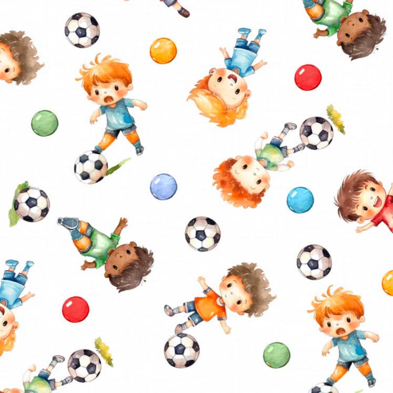 Este diseño evoca la diversión de un partido de fútbol con un encantador estampado de niños jugando con balones y balones de colores que se distribuyen de forma armoniosa sobre un fondo blanco.