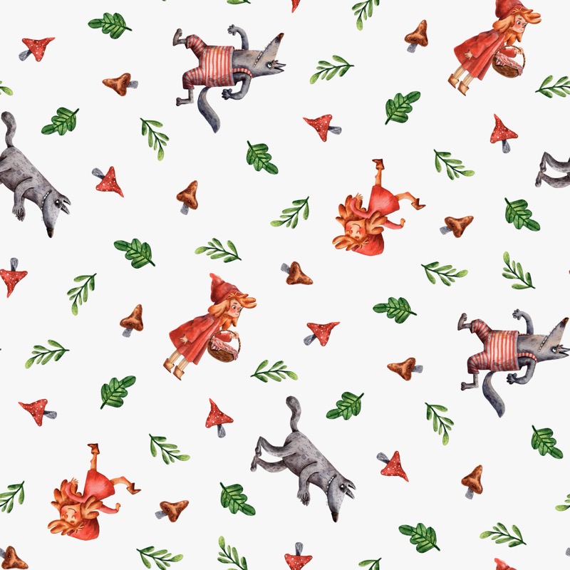 Este diseño es pura magia, con un estampado de Caperucita Roja que se encuentra con el lobo feroz, rodeados de árboles, setas y flores.