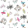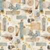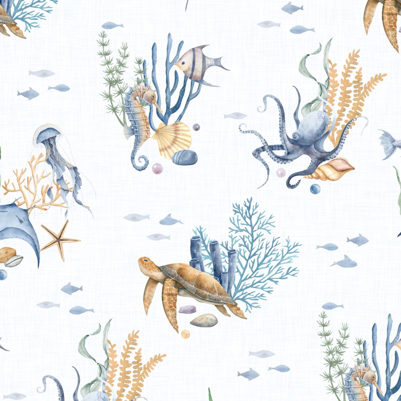 Este patrón evoca la serenidad de las profundidades marinas con ilustraciones de criaturas marinas como tortugas, caballitos de mar y pulpos, que nadan entre corales, conchas y algas. La paleta de colores, con tonos de azules, grises y marrones suaves sobre un fondo de líneas de agua, aporta una sensación de calma a cualquier espacio.