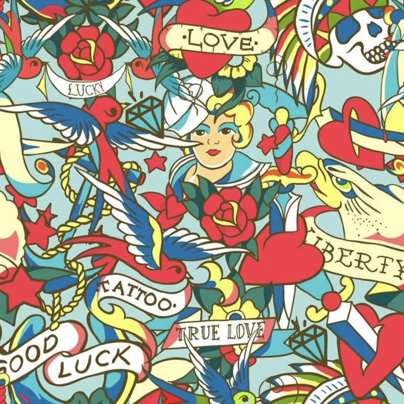 El estampado es una explosión de elementos icónicos: corazones, rosas, anclas, golondrinas, calaveras y sirenas, todo entrelazado con cintas que llevan mensajes como «LOVE», «LUCKY» y «TRUE LOVE». Los contornos marcados y una paleta de colores vibrantes —rojo, azul marino, amarillo y blanco— sobre un fondo azul claro, le otorgan una estética vintage y rebelde, llena de personalidad.