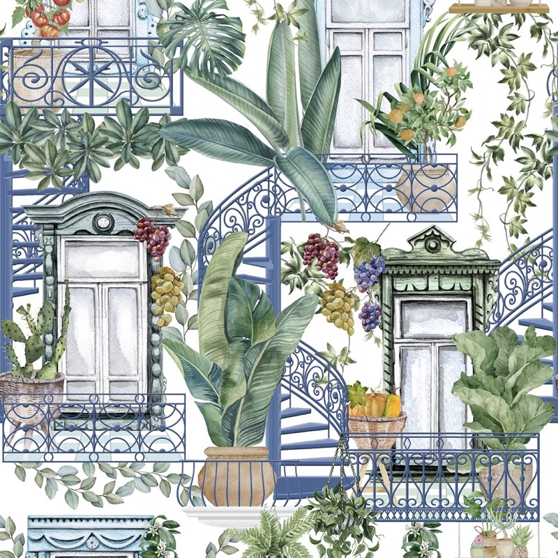 Este patrón presenta un detallado dibujo de balcones de hierro forjado, escaleras de caracol y ventanas tradicionales, todo ello decorado con plantas exuberantes y racimos de uvas que caen elegantemente.