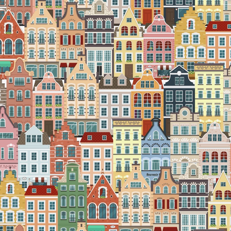 Este patrón captura la belleza de las icónicas fachadas de las casas de Amsterdam, con un estilo ilustrativo y lleno de color. Los diferentes tonos pasteles, ocres y rojos se combinan para crear una imagen alegre y vibrante.