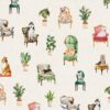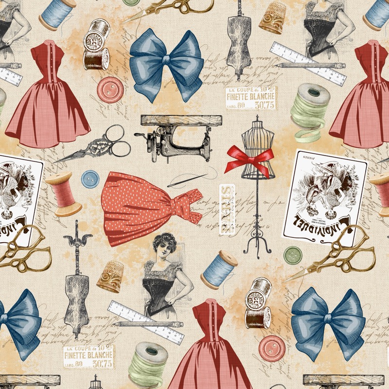 Este patrón es un homenaje al arte de la alta costura, con un detallado estampado de vestidos, maniquíes de costura, bobinas de hilo, tijeras y elementos de mercería, todo sobre un fondo de color beige que simula la textura de un papel antiguo. Los tonos de azul, rosa y ocre se combinan para crear una estética vintage y elegante.