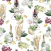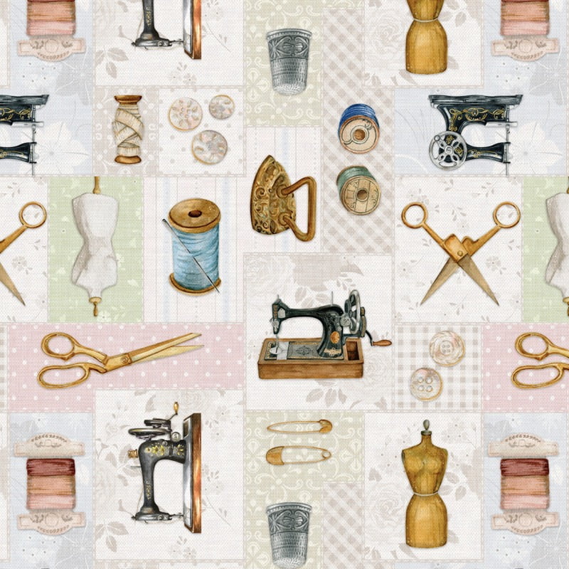 Este patrón, con una estética de collage, presenta un detallado diseño de máquinas de coser antiguas, maniquíes de costura, tijeras, bobinas de hilo y dedales. Los elementos se asientan sobre un fondo de cuadrados con diferentes patrones, como lunares, rayas, flores y cuadros vichy, en una paleta de tonos pastel.
