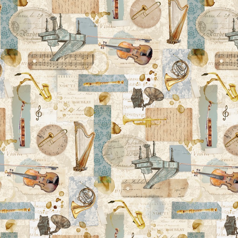 Este patrón es un cautivador collage de instrumentos clásicos, partituras, sellos y manchas de café, que se entrelazan de forma armoniosa sobre un fondo con textura que simula un antiguo papel de pergamino. La paleta de colores, con tonos de ocre, azul y marrón, le da un aire vintage y sofisticado.